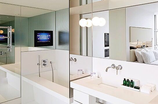O espelho é constituído por uma base de vidro float (monolítico) que lhe é pulverizado uma cor prata. Por fim leva um pintura termo endurecida para que a luz não trespasse para a frente do espelho.Torna o espaço mais amplo.